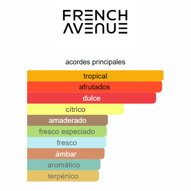 Vulcan Feu de French Avenue es una fragancia unisex audaz y tropical. Una explosión inicial de mango jugoso, limón vibrante y jengibre da paso a un corazón floral y dulce. Su fondo de maderas nobles, ámbar gris y haba tonka crea una estela adictiva y duradera. ¡Perfecto para quienes buscan destacar con un aroma inolvidable!